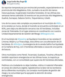 Sobre lo anterior se pronunció el gobernador de Cundinamarca, Jorge Rey, quien denunció que las altas temperaturas, sumadas a las prácticas indebidas de algunos habitantes, son las principales causas de estos incendios, afirmando que se atendieron 30 incendios en las provincias Alto Magdalena, Gualivá, Sumapaz, Sabana Centro, Tequendama y Ubaté, durante las últimas dos semanas.