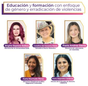 Los ejes temáticos de la actividad son: Salud Mental que contará con la participación de la representante a la Cámara Olga Lucia Velásquez; el segundo es Mujeres en la Academia con la intervención de la ministra de Ciencias y Tecnología, el tercero Educación y formación con enfoque de género y erradicación de violencias destacando a la rectora de la EAN, Brigitte Baptiste, el cuarto eje será Legislación con enfoque de género destacando a Erika Tatiana Sánchez, representante a la cámara y la ministra de las TIC, el quinto sobre Liderazgo Financiero y